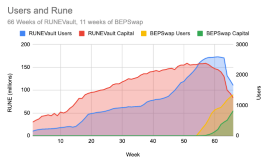 The job of the community is to now ease the transition from RUNEVault to BEPSwap where capital is being put to use in the pools. The flippening is likely to occur in ~ 1 week for user count, and ~3 weeks for capital amount.