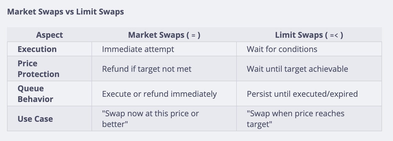 Limit Swaps let users set the exact price they want for a trade. Instead of being refunded if the price isn’t met, the swap stays in the queue and waits until the target price is reached. These swaps are persistent, cancellable, and execute automatically once conditions are satisfied.