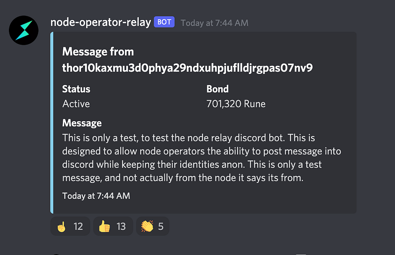 Nodes will be given an ability to broadcast a signed messaged directly from their machines. A discord/telegram bot can monitor and relay to channels. The messages are not put anywhere on-chain, they are just signed using node keys. The discord bot checks the node is active and grabs their address, status and bond amount.