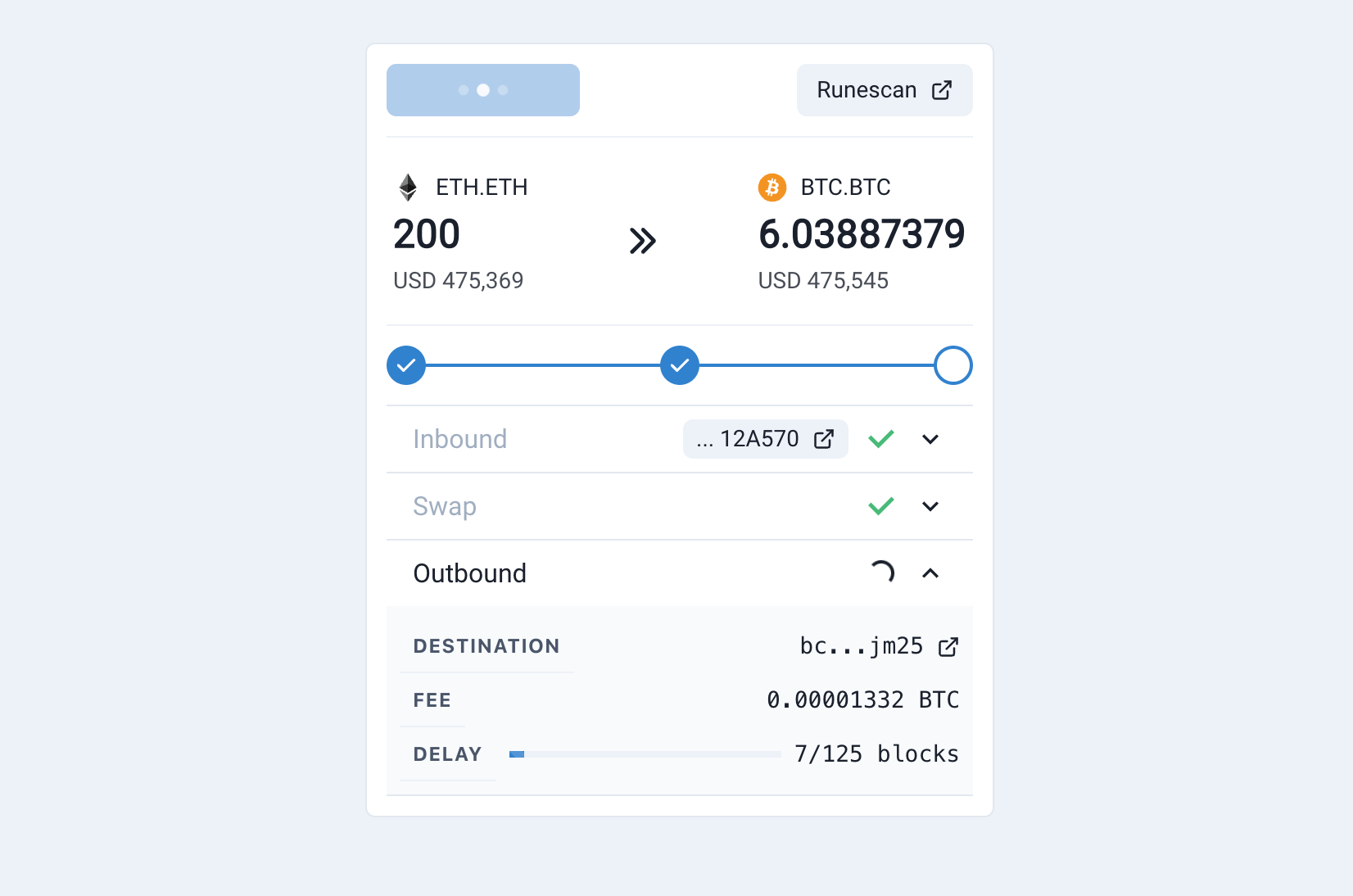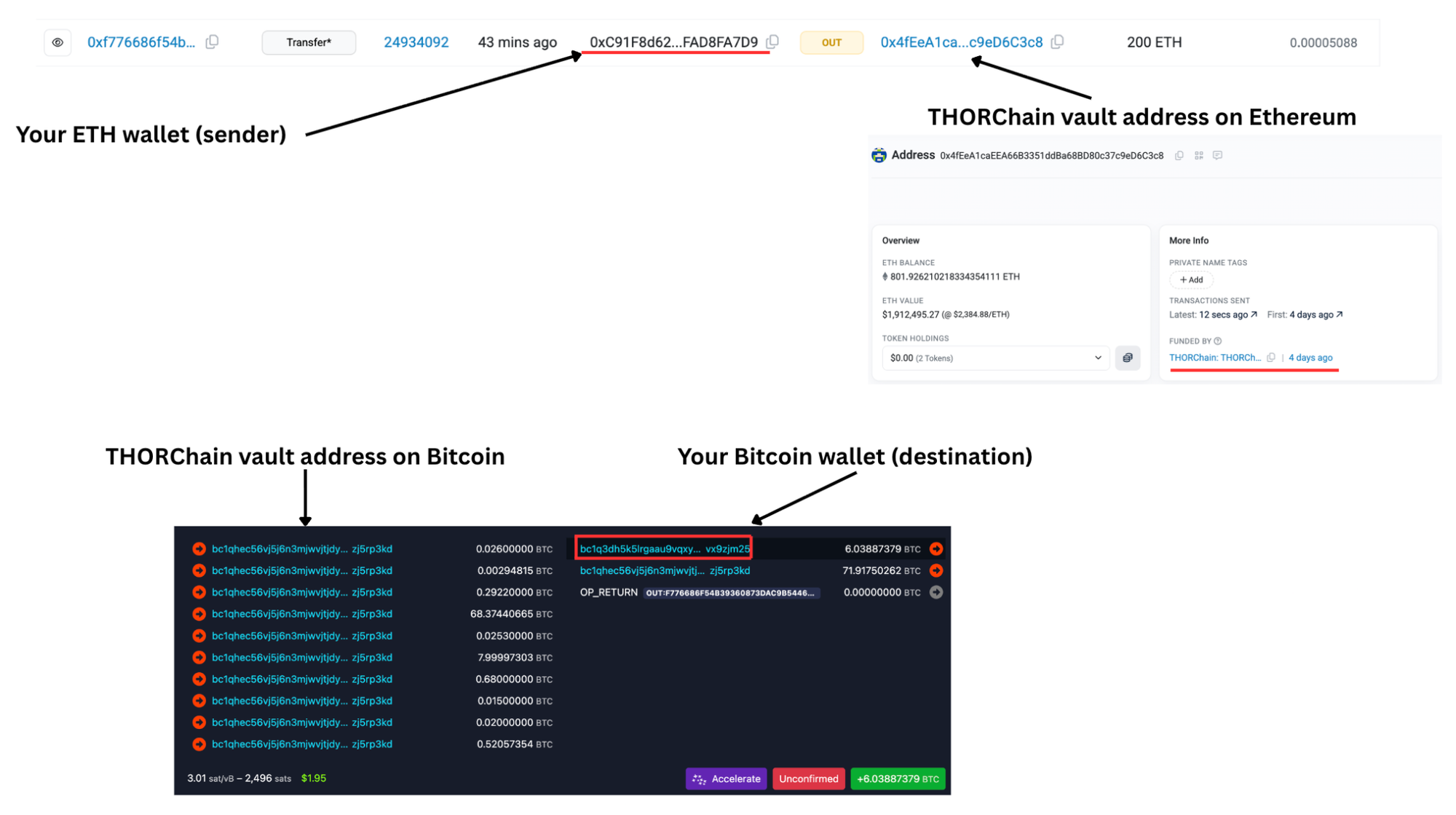 To sum up, when a user executes a swap on THORChain, every step is recorded and publicly accessible. All transactions are visible onchain, and settlement occurs directly on the respective blockchains involved in the swap: Ethereum for the inbound transaction, THORChain for the swap execution, and Bitcoin for the outbound transaction.