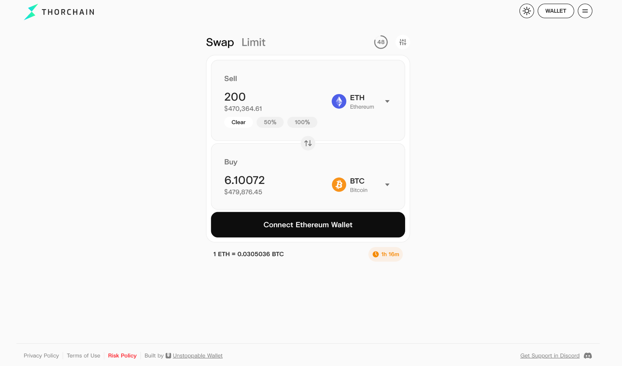Let's walk through a real example where a user wants to swap 200 ETH for BTC using THORChain's native interface.
