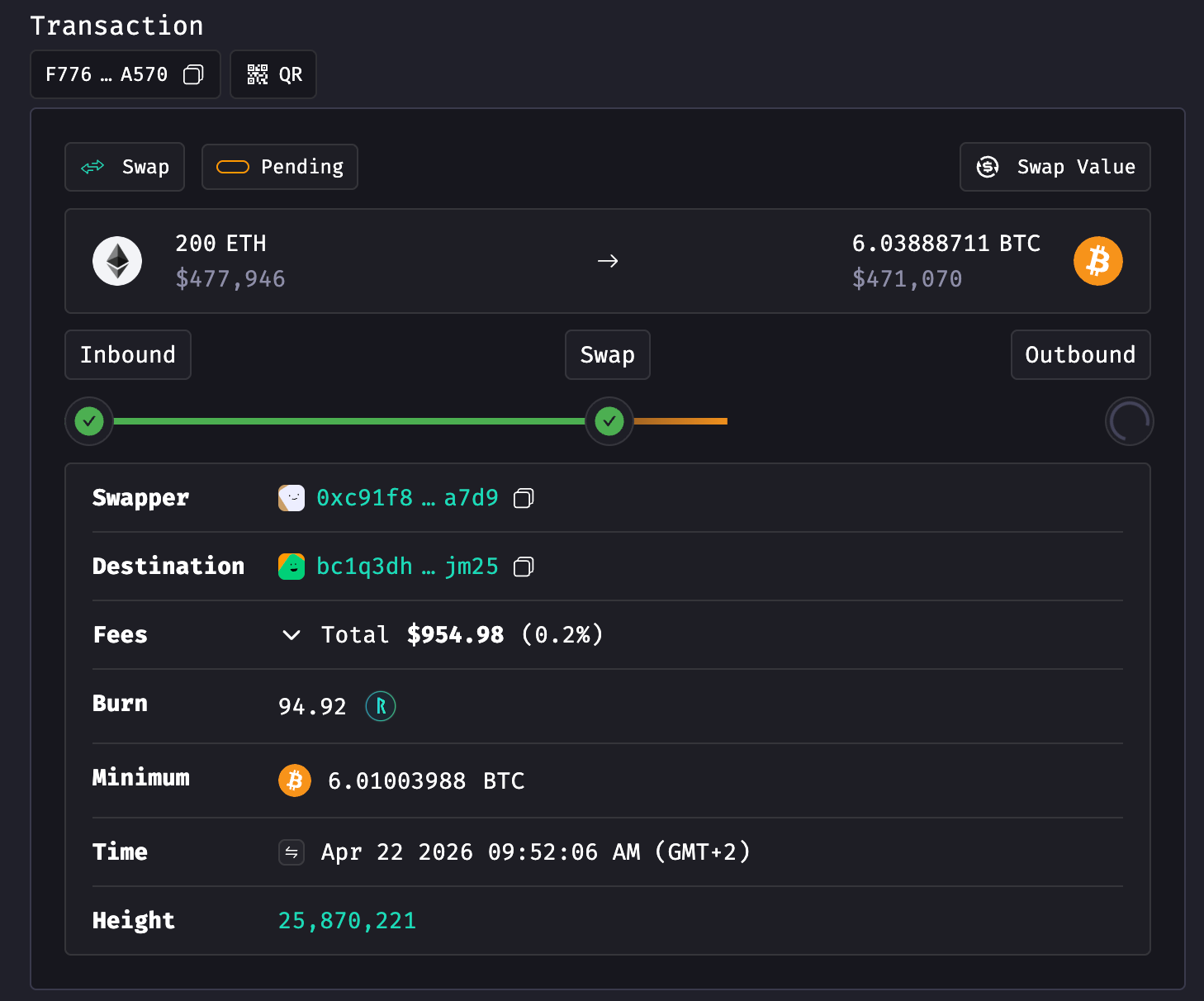 Once the inbound is confirmed by the nodes, the protocol executes the swap internally through its own liquidity pools and sends the equivalent value in BTC to the address provided by the user. This step is the outbound.