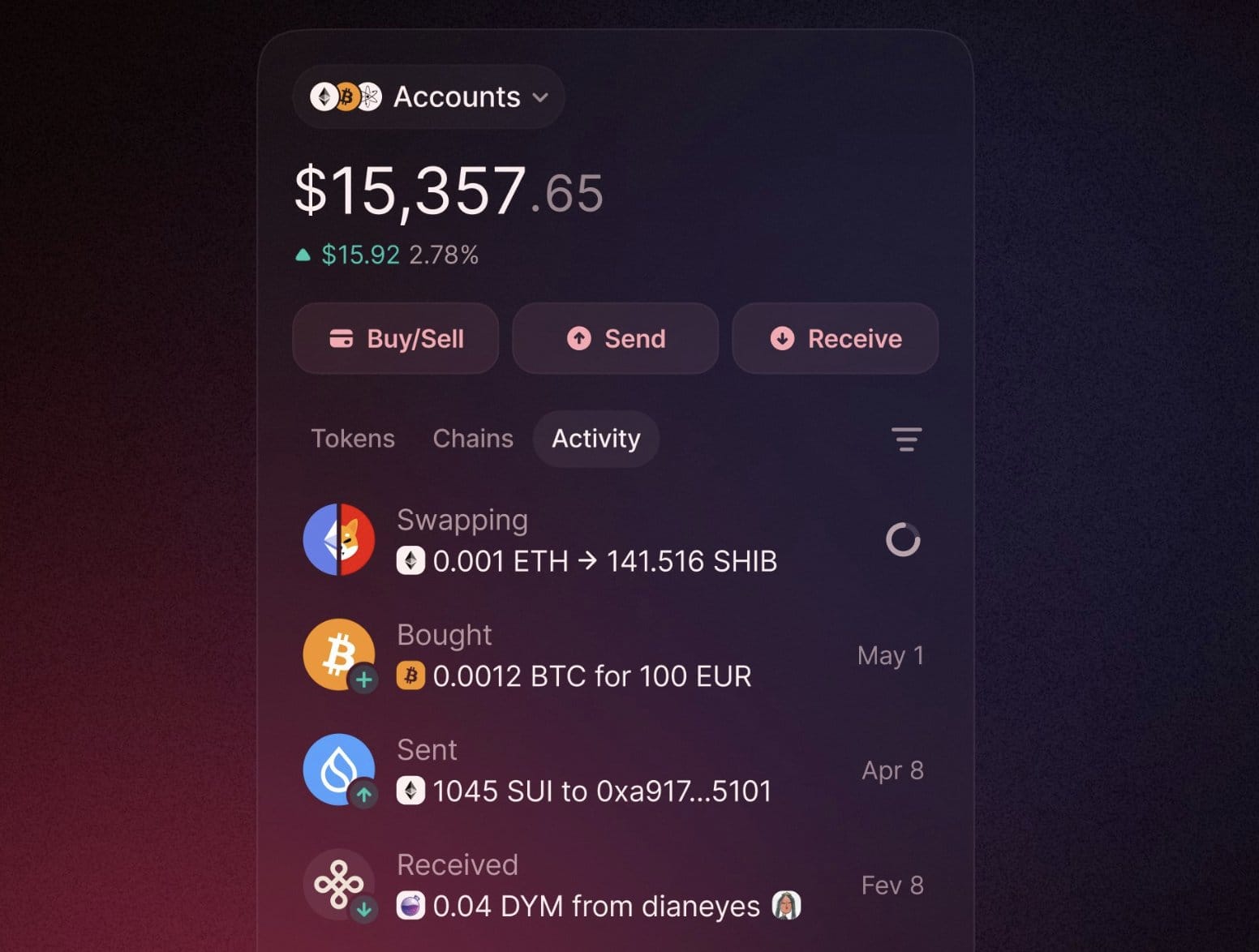 Once you connect your wallet, Junction displays your entire portfolio, showing balances for each token on its respective chain. The Activity section is particularly well thought out: instead of needing to dig through block explorers, you get a clear visual record of swaps, received funds, sent funds, and more.