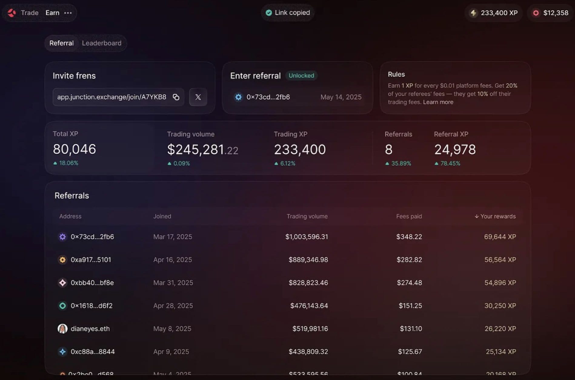 Referrals sweeten the deal as referred friends get a 10% discount on trading fees, while you earn XP equal to 20% of their trading fees.