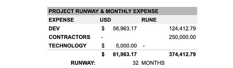 The current project runway has been increased to 32 months. All team members are paid 70% in USDT and 30% in RUNE for alignment with the project.