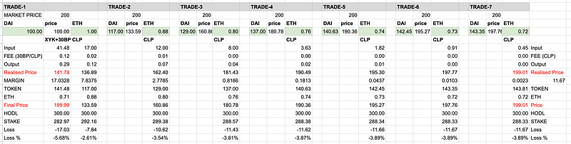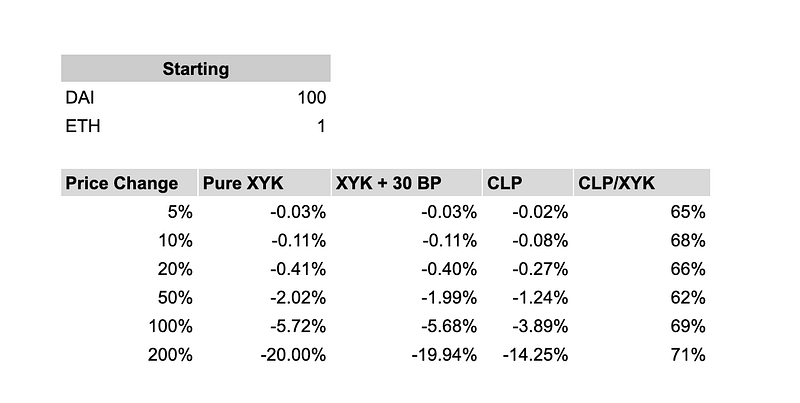 It can be seen that in all cases the Impermanent Loss for CLP pools is less than that for XYK pools. The exact relationship will be derived at a future point in time.