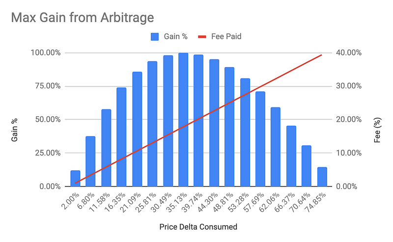 Looking at a single trade, the following is apparent. As the trader attempts to take more of the opportunity, the fee paid for the privilege of doing so increases commensurately. The trader will make a margin the entire time, but there is a sweet spot where their margin is at a maximum. Any higher than this, the fee will reduce their margin. This sweet spot is between 1/3rd and 1/2th of the opportunity (relationship yet to be derived).