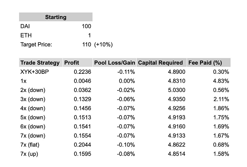 With a starting pool described below, and a 10% arbitrage opportunity, the team identified 9 different trading strategies, and compared to the XYK+30BP set-up.