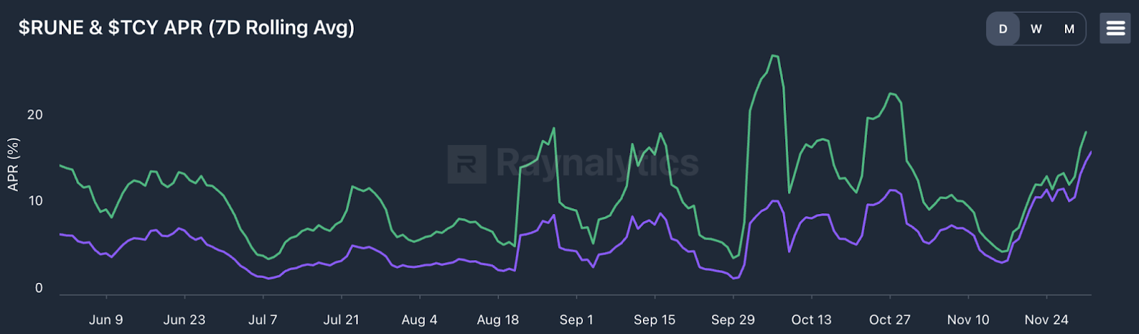 After the volatility caused by fee experimentation in September and October, and the challenges at the beginning of the month, yields for both bonded RUNE and staked TCY are now back in an uptrend.