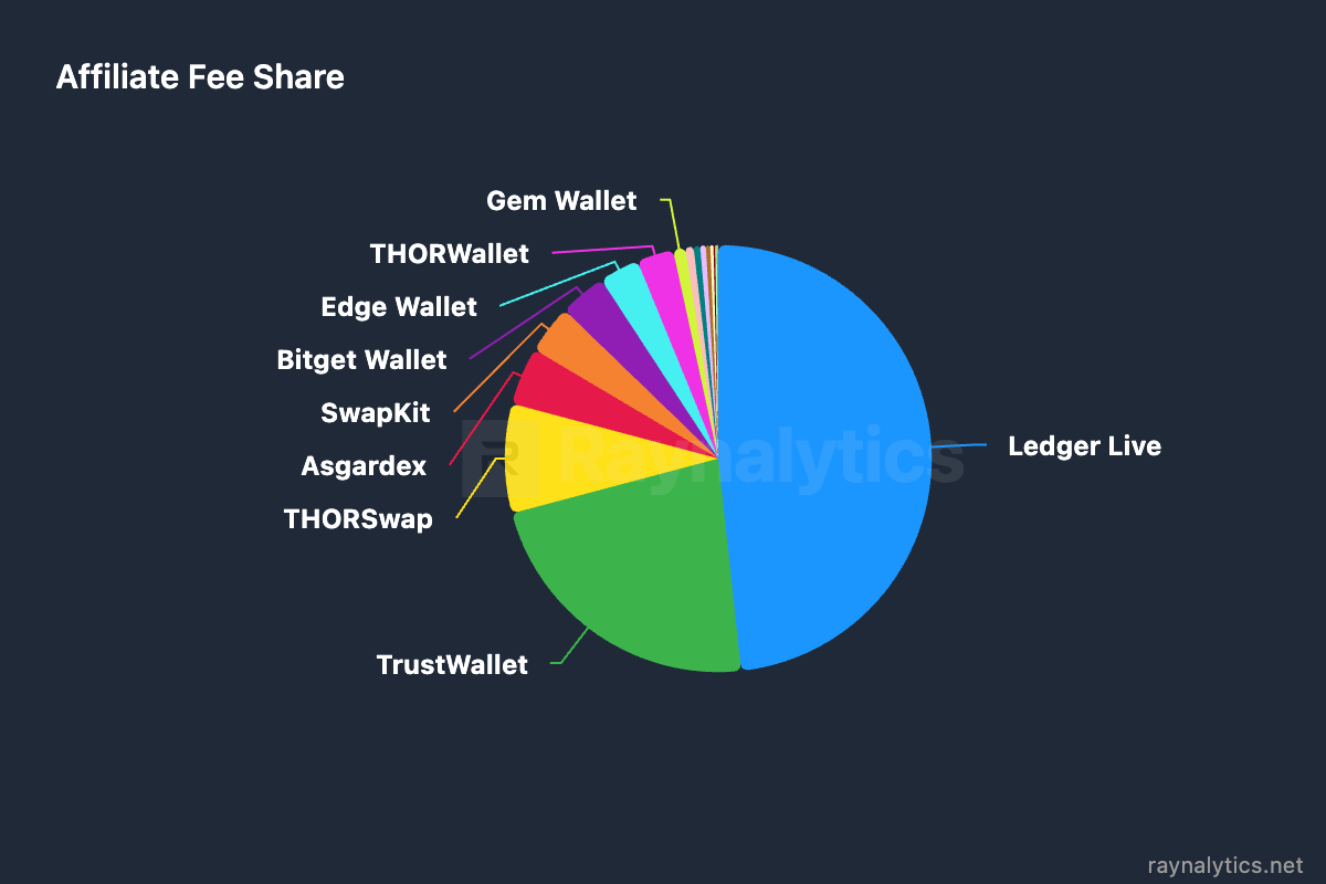 For November, Ledger Live led fee generation with 48.3 percent and $451k collected. It was followed by THORWallet with 22.6% and $211k, and THORSwap with 8.3% and $77.3k. Being a THORChain Affiliate has proven to be a highly lucrative strategy for both DEXs and wallets. To date, affiliates have collectively accumulated $45 million in fees thanks to THORChain.