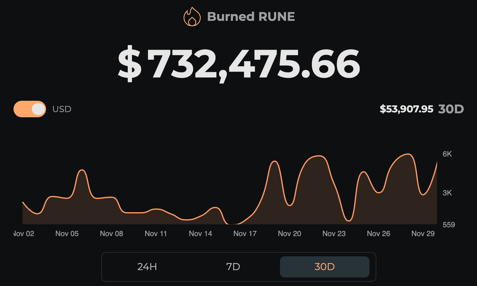 Total RUNE burned to date: $732k, with $54k burned in November. Burns continue steadily without announcements or campaigns, purely the protocol mechanics doing their job.