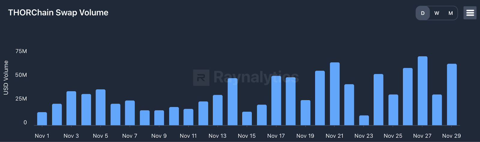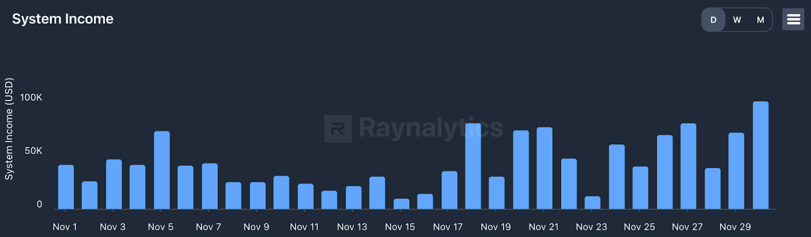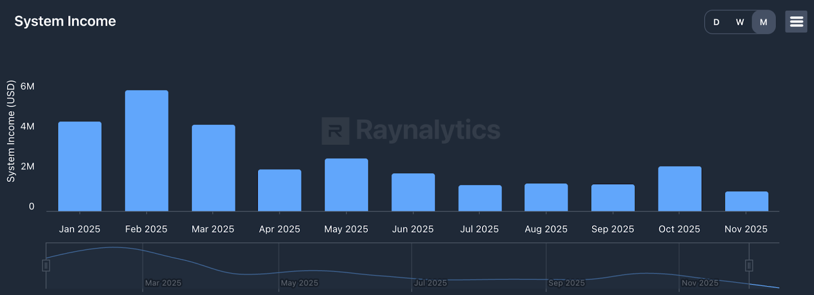Fees mirrored the volume trend. Revenue was low early in the month before recovering mid-November. Zooming out, fee generation dropped from roughly $2.2M in October to around $1M in November, with the factors mentioned above being the main drivers.