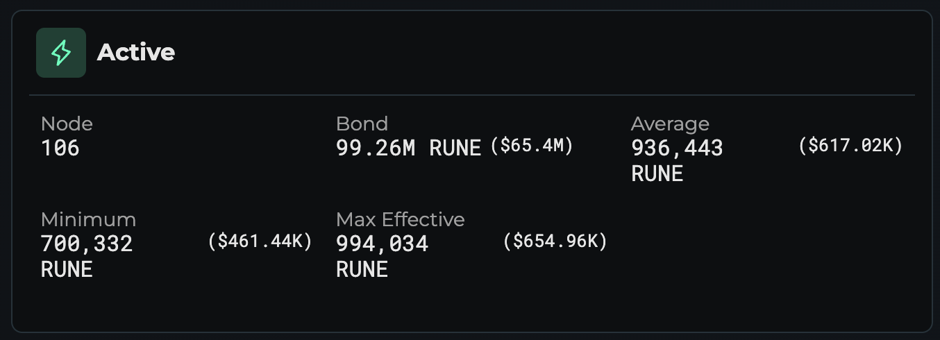 Currently, 106 nodes (maximum possible 120) maintain the network with 99.26M RUNE bonded ($65.4M). The average bond sits at $617k per node, representing substantial capital at risk given the minimum requirement of 700k RUNE ($461k).