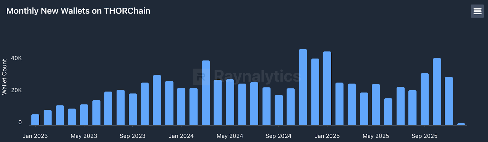 Despite lower volume, user growth remains strong. With 29.9k new wallets created in November (down from 41.6k in October, but still above the 2025 average of 28.1k), THORChain continues to convert new users.