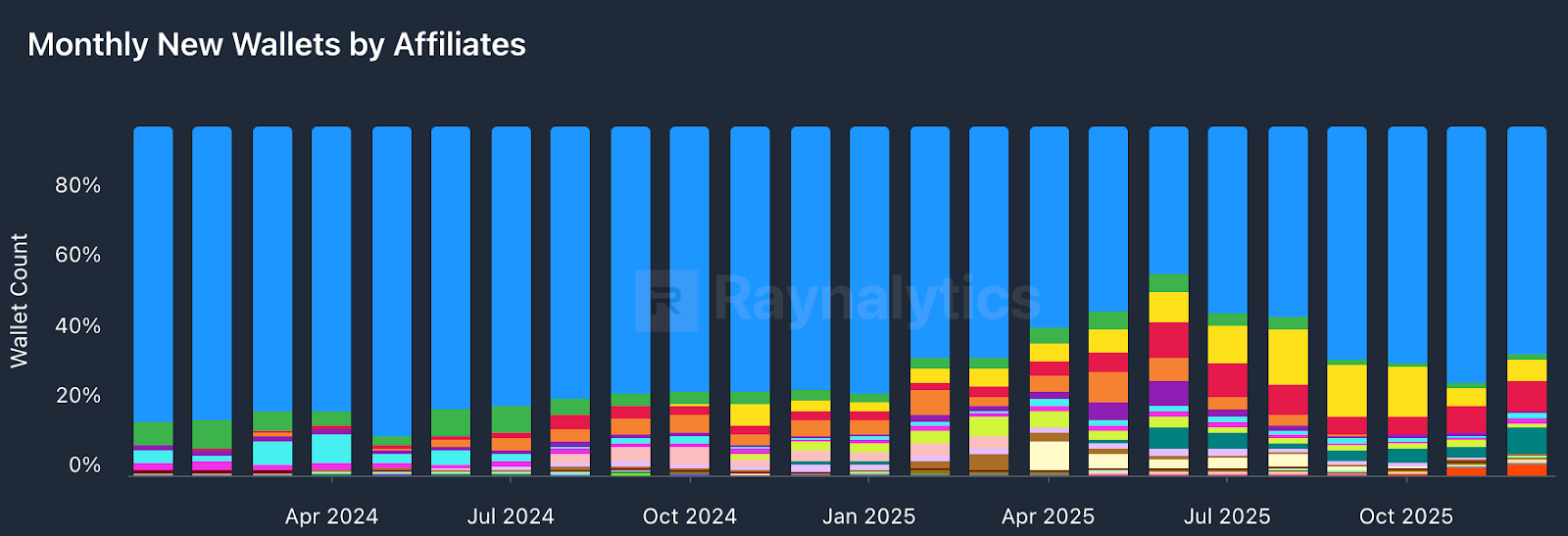 One of the key trends in 2025 has been the growing share of new wallets onboarded through affiliates. While TrustWallet dominated throughout the year, in November the breakdown was as follows: TrustWallet at 65% (blue), Edge Wallet at 8.9% (red), TokenPocket at 7.3 percent (green), Ledger at 6.1% (yellow), and THORChain Swap at 2.9% (orange). The affiliate strategy continues to prove effective in consistently onboarding new users.