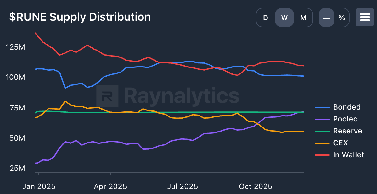 Nearly half of all circulating RUNE is actively securing or powering the network. CEX balances continue trending down as RUNE moves into LP positions and self-custody.