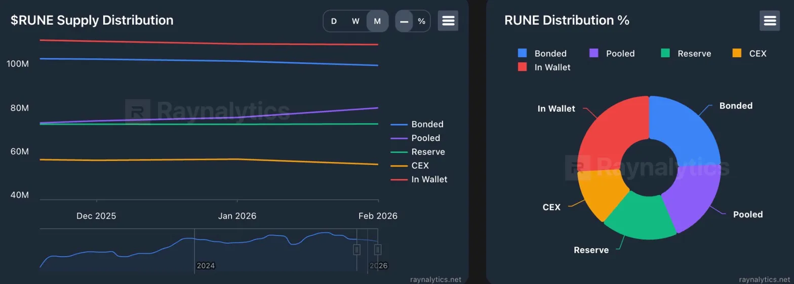 Supply distribution remained structurally healthy throughout February. Bonded RUNE held around 97M, pooled liquidity approximately 80M, reserve near 72M, and CEX balances roughly 54M. Nearly half the circulating supply actively secures the network or provides cross-chain liquidity, while less than 13% sits on exchanges. The slow migration away from CEX into productive protocol usage continued, demonstrating participant conviction even through quiet market conditions.