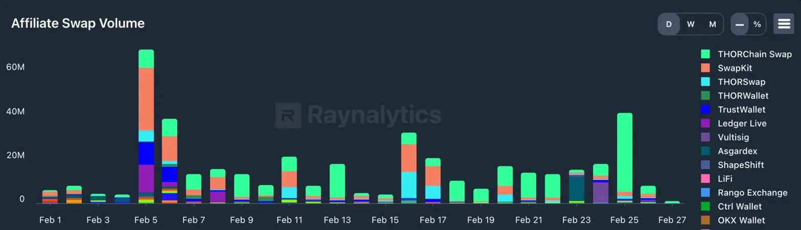 February's affiliate distribution shows interesting patterns. THORChain Swap (green, the native frontend) dominated on the three highest volume days: February 5th, 6th, and 25th. SwapKit (coral) maintained consistent presence throughout the month, processing steady baseline volume. TrustWallet (blue) appeared regularly but less prominently than in previous months.