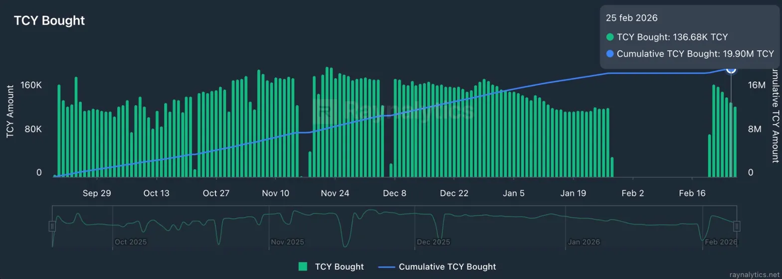 February marked the resumption of TCY buyback operations. The protocol began with daily buybacks ranging from 80K to 160K TCY. Cumulative purchases reached 19.90M TCY by February 25th.