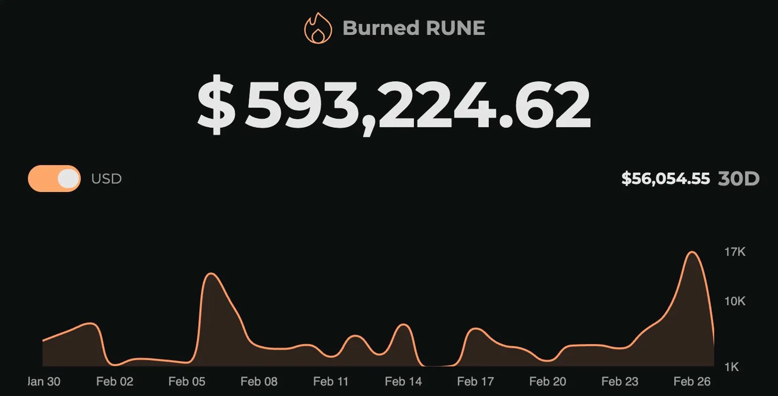 February burned $56K in RUNE, up from January's $48K despite lower overall volume. The chart shows two clear spikes: February 5th and February 25th, both coinciding with the $100M volume days. Daily burns otherwise held steady between $1K to $3K, reflecting baseline fee generation. The mechanism continues operating automatically, removing 5% of system income from circulation regardless of market conditions.