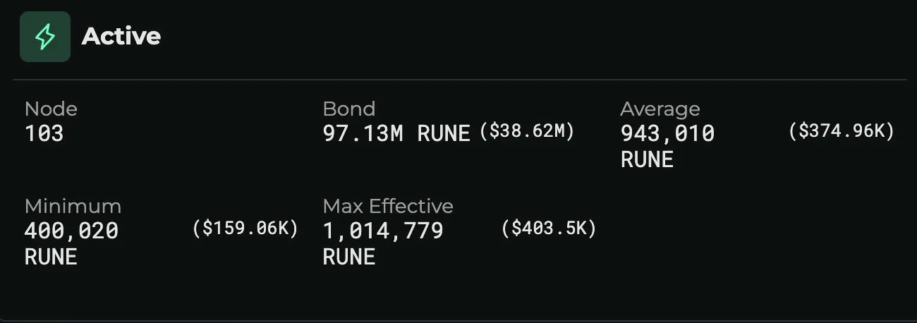 The minimum bond requirement sits at 400,020 RUNE ($159.06K), while the maximum effective cap reached 1,014,779 RUNE ($403.5K). With 103 active nodes against maximum capacity of 120, the network operates with room for expansion when conditions improve and additional operators decide participation makes economic sense.