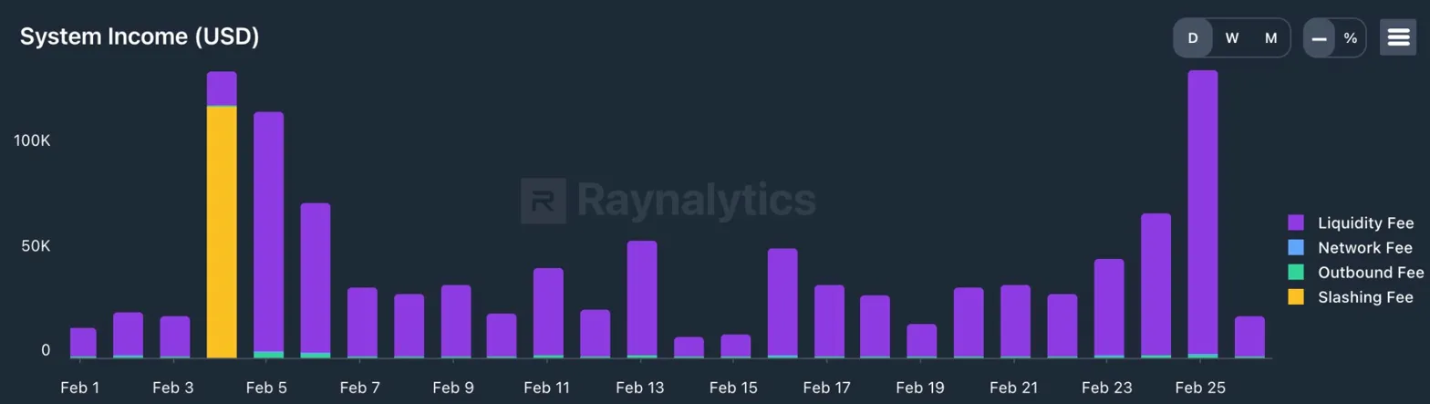 February closed as a building month. Volume compressed to $882M from January's $1.07B, but the protocol kept shipping: Solana integration launched, limit orders went live, and TCY buyback resumed. Despite reduced activity, the network generated over $1M in revenue and improved yields, with RUNE APR reaching 21.39% and TCY hitting 10.61% by month's end.