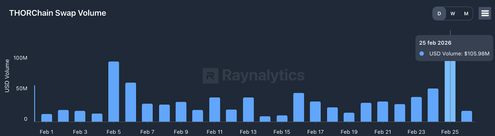 February delivered mixed signals. Volume tracked toward $882M through month end, down from January's $1.07B, following the broader consolidation in the market. But February also brought meaningful developments for THORChain: Solana integration finally arrived with progressive rollout, limit orders launched, and TCY buyback resumed.