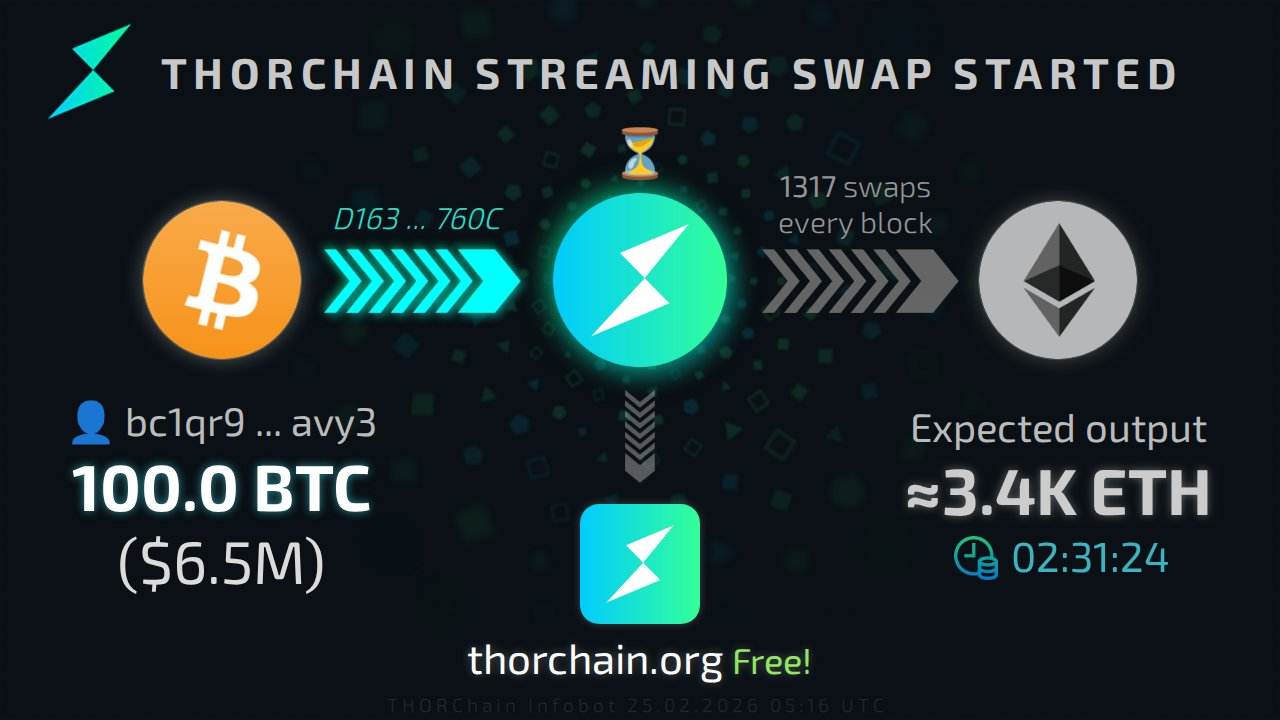February saw significant concentrated activity through thorchain.org's native interface, with particularly notable swaps of 50, 88, and 100 BTC all converting to ETH and landing at the same Ethereum address.The 100 BTC transaction alone represented $6.5M. Routing through thorchain.org rather than affiliate interfaces means zero affiliate fees. Every basis point flows directly to the protocol: node operators, liquidity providers, TCY holders, burns, and treasury.