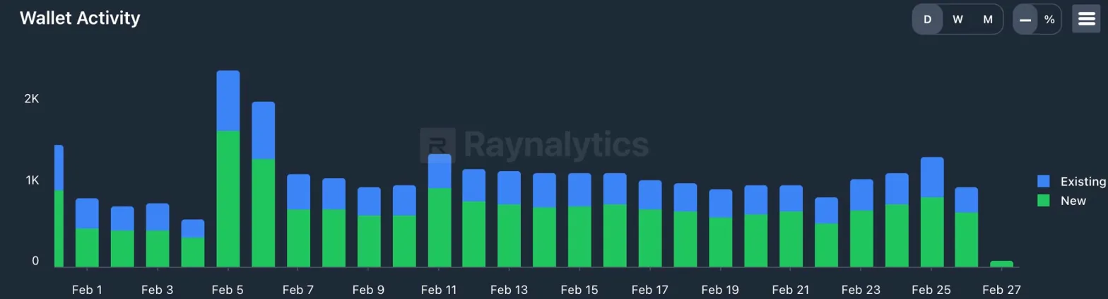 February brought 19.2K new wallets to THORChain while maintaining solid returning user activity throughout the month. The chart shows a healthy mix of blue (existing users) and green (new wallets) across most days, demonstrating that both acquisition and retention continued functioning despite quiet markets.