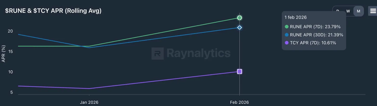 Yields moved in the right direction throughout February. RUNE APR climbed from roughly 16% at the start of January to 21.39% by month's end on a 30-day rolling average, with the 7-day rate hitting 23.79% as February closed. TCY followed a similar trajectory, rising from around 6% to 10.61% on the 7-day metric. February proved that even quiet months can deliver improving returns when protocol mechanics function properly.