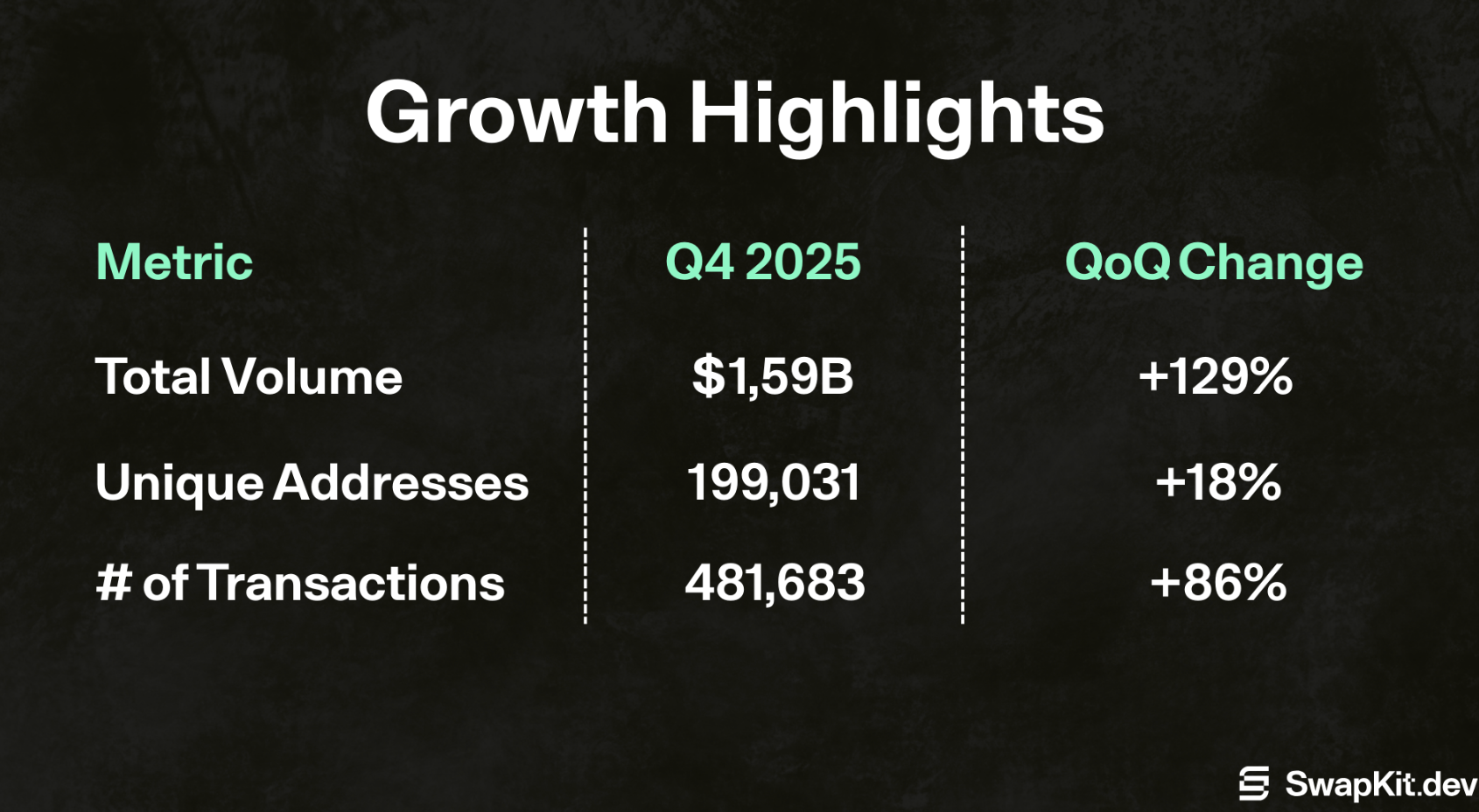 This adoption translates into meaningful onchain activity. More than 100,000 wallets have interacted with SwapKit, with over $1.59 billion in volume processed and approximately 480,000 transactions executed in Q4 2025 alone.
