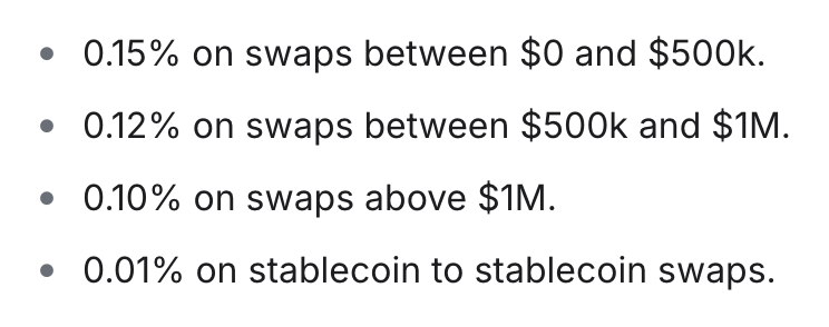 SwapKit applies a small service fee on swap volume, using a tiered structure that becomes more competitive as trade size increases. Fees decrease for larger swaps and are particularly low for stablecoin-to-stablecoin trades, ensuring the solution remains attractive for both retail users and high-volume flows.