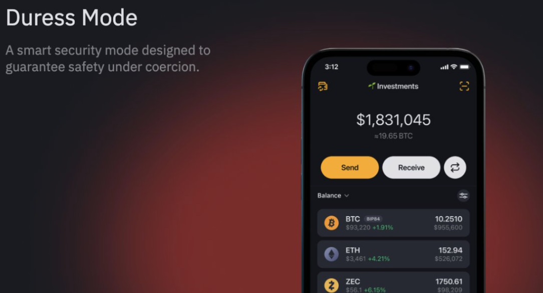 One of the wallet’s most striking features is duress mode, a safeguard built for real-world threats. It allows users to create a decoy wallet that looks authentic but only contains a small balance.
