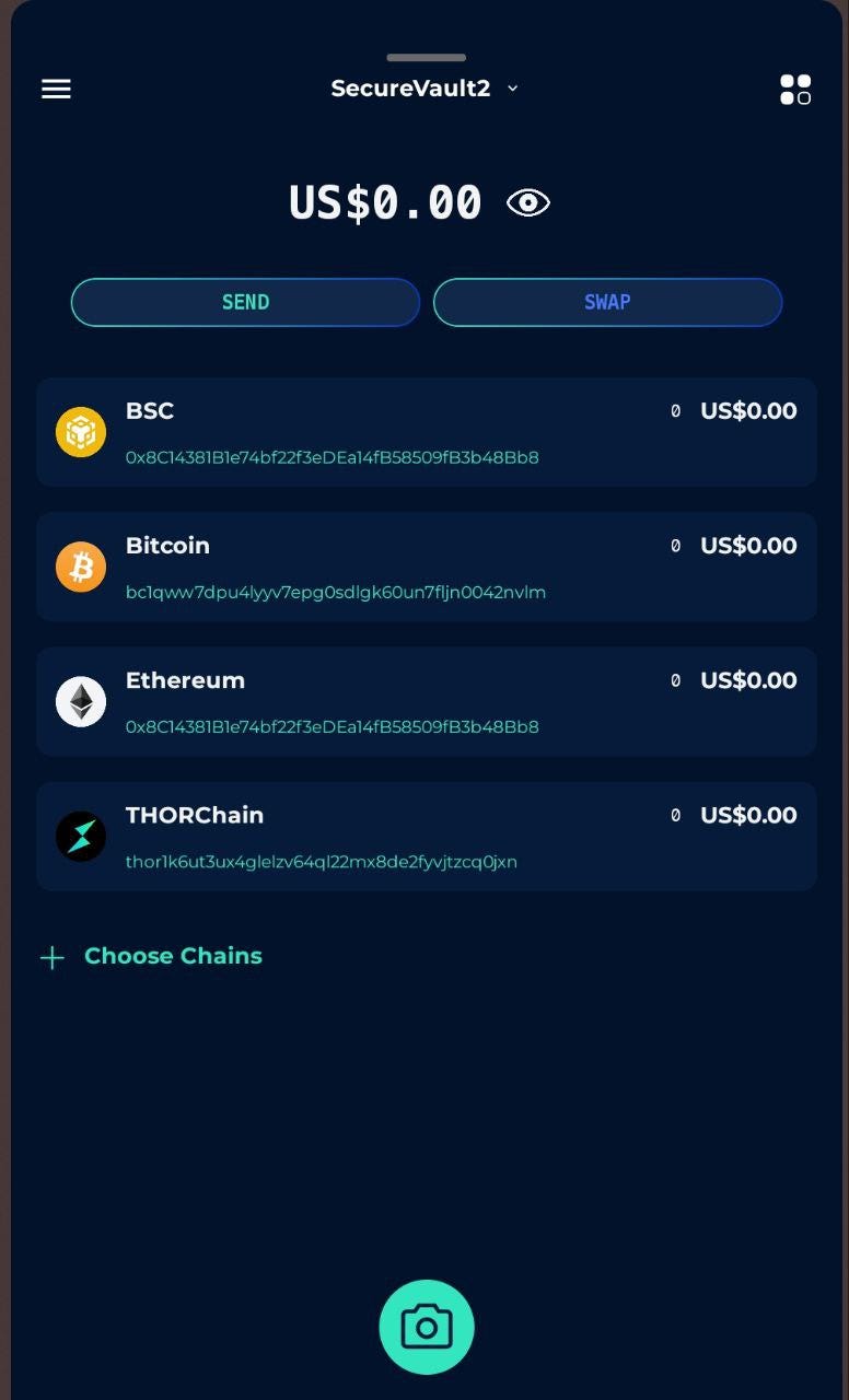 3. Cross-check wallet addresses: On the main vault page, perform a cross-check of the wallet addresses to ensure they are identical across all 3 devices. Since Vultisig is a multichain vault, you may select major blockchains (e.g., Bitcoin, Ethereum, THORChain, BSC and Solana) to do this final cross-check. <Refer to Photos 4, 5 & 6.>