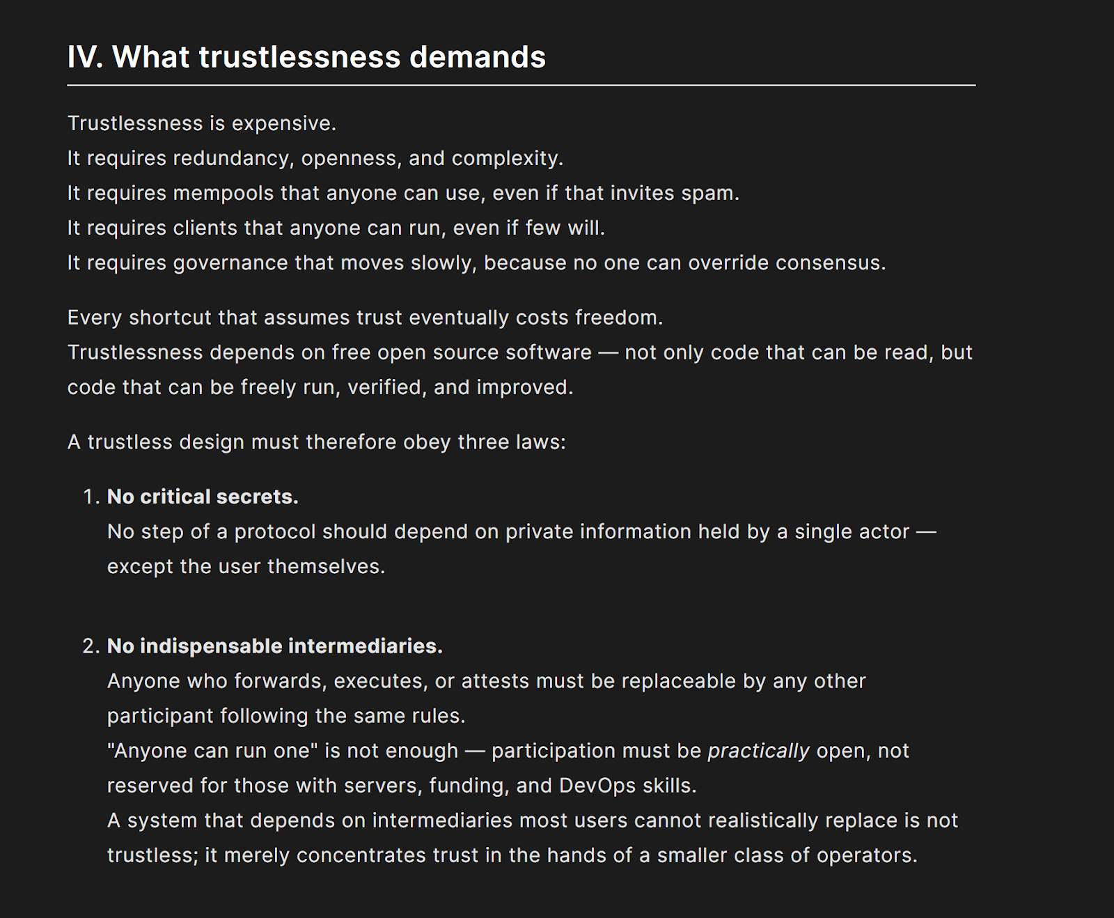 One of the most important parts of this, and something Vitalik Buterin has also been touching on recently with his trustless manifesto, is that we need to start talking seriously about how trustless our systems actually are.